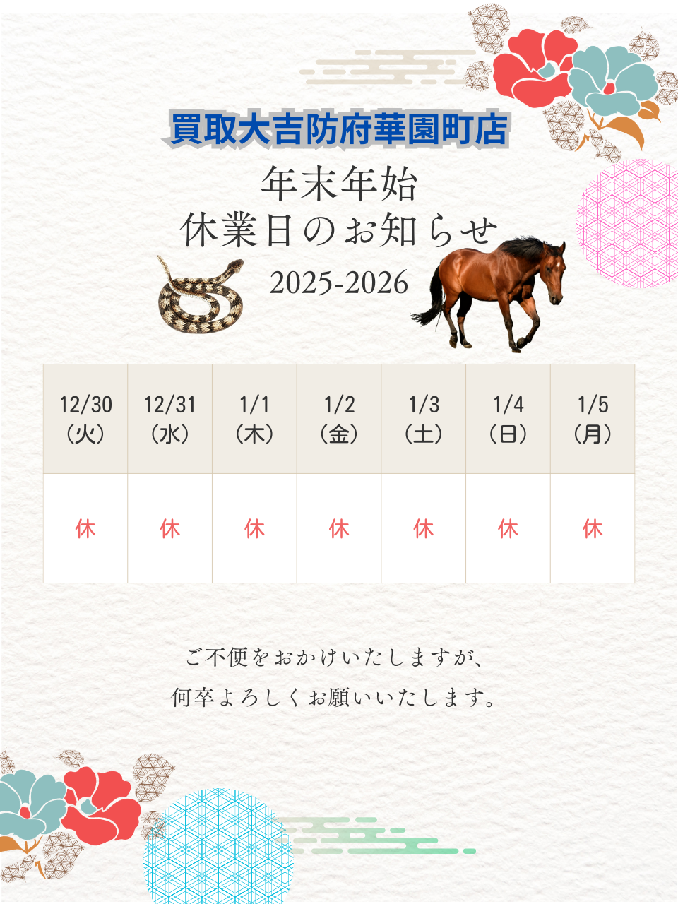 12月30日~1月5日までお休みをいただきます。